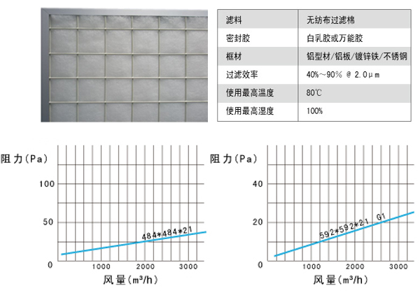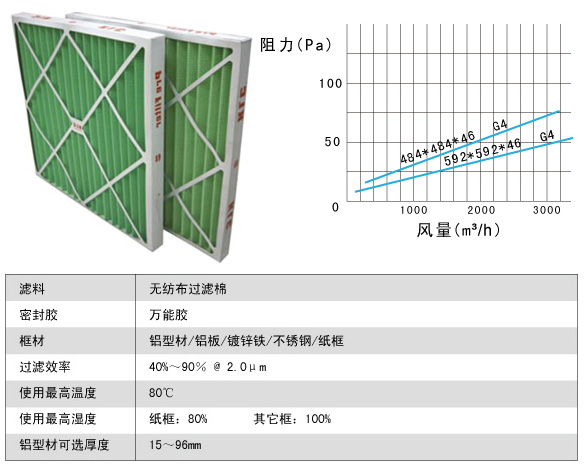 過濾效率:G1:40%@5.0μm、G2:65%@5.0μm、G3:85%@5.0μm、G4:90%@5.0μm(計重法);