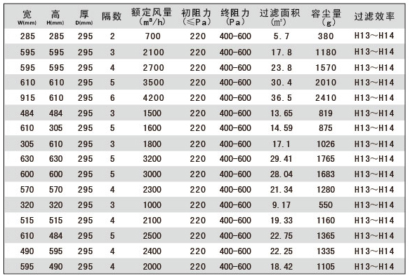 耐高濕有隔板高效過濾器型號尺寸及其它參數